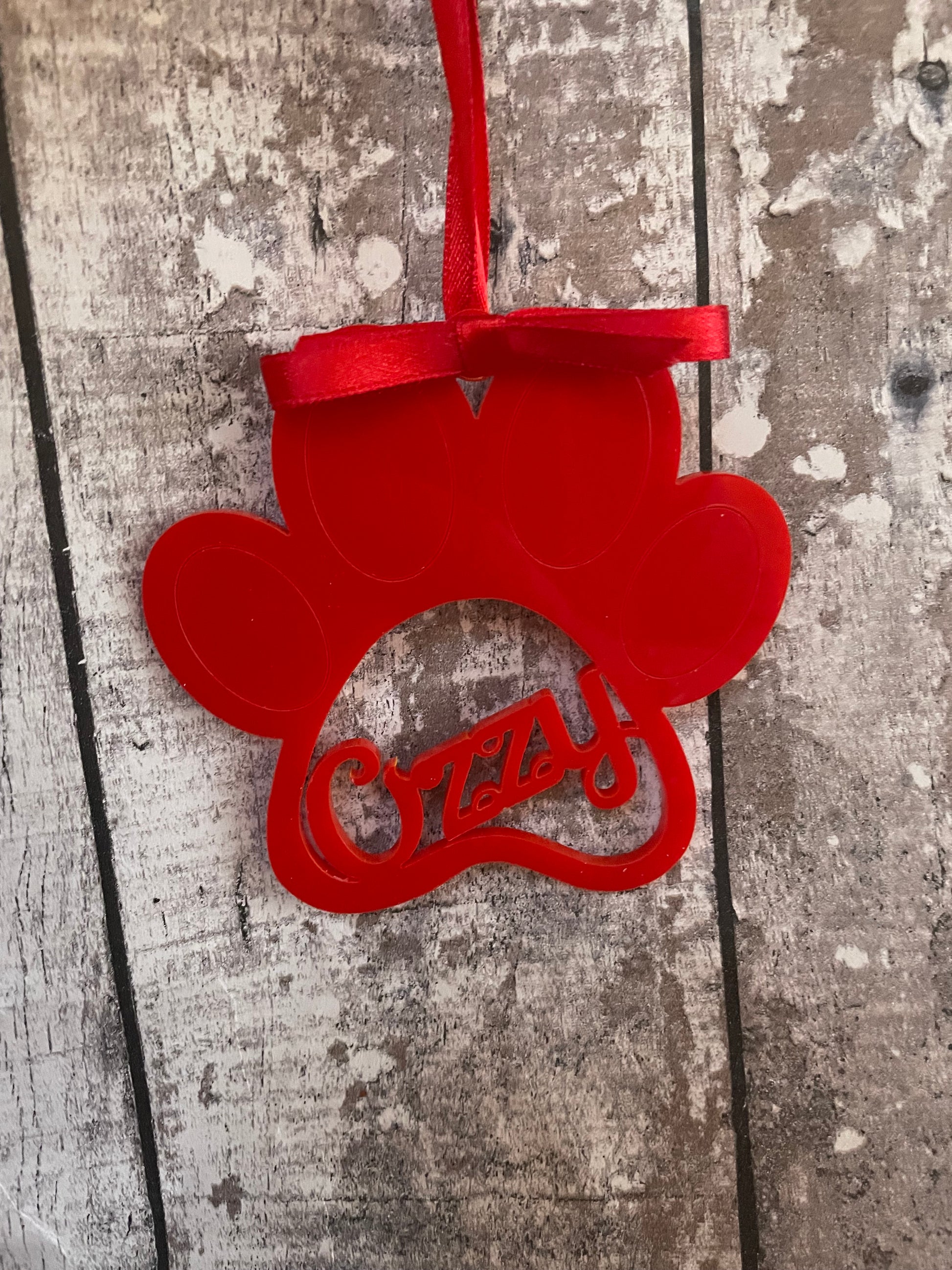 Indulge in the 10cm acrylic paw bauble personalised with your pet's name in a variety of vibrant colors. Show off your fur baby's unique identity with this special keepsake.